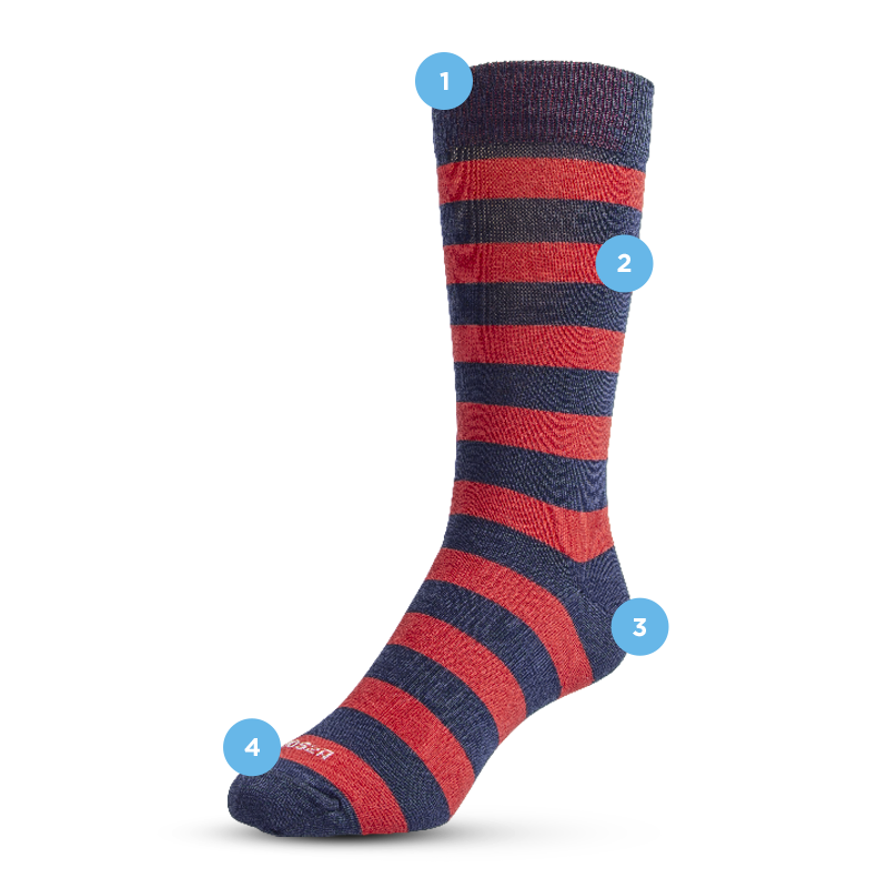 A fine knit merino dress sock for business or casual wear in a classic stripe style. Merino knitted to the inside with nylon reinforcing to the outer of the heel and toe for a great wearing sock.